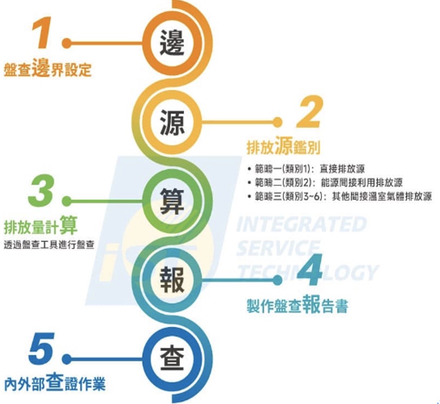 標準二 ISO 14064-2數據化公司做的減碳努力。擬定公司排碳熱點的「減碳專案計畫」,透過五大步驟「邊、源、算、報、查」,報告書目的是檢視減碳成效。