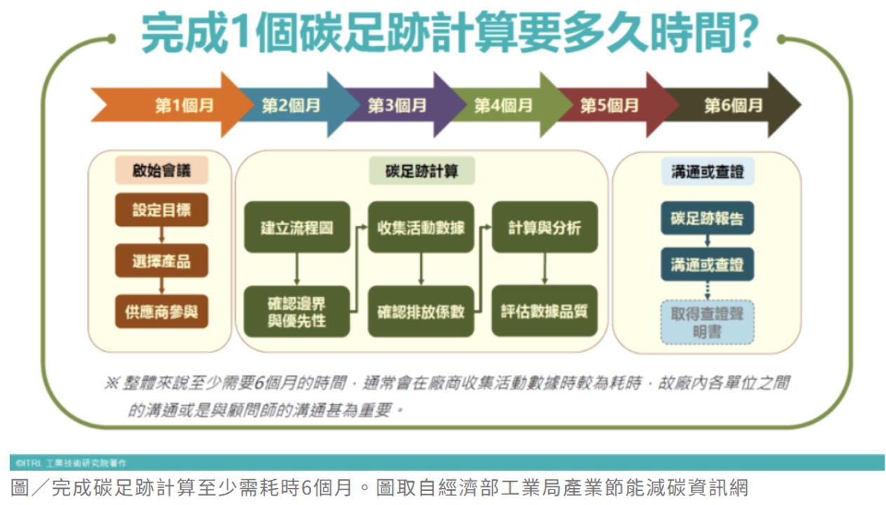 產品碳足跡往往需要組織內多個部門溝通進行,也需上下游供應商合作參與,整體來說至少需要6個月的時間完成。