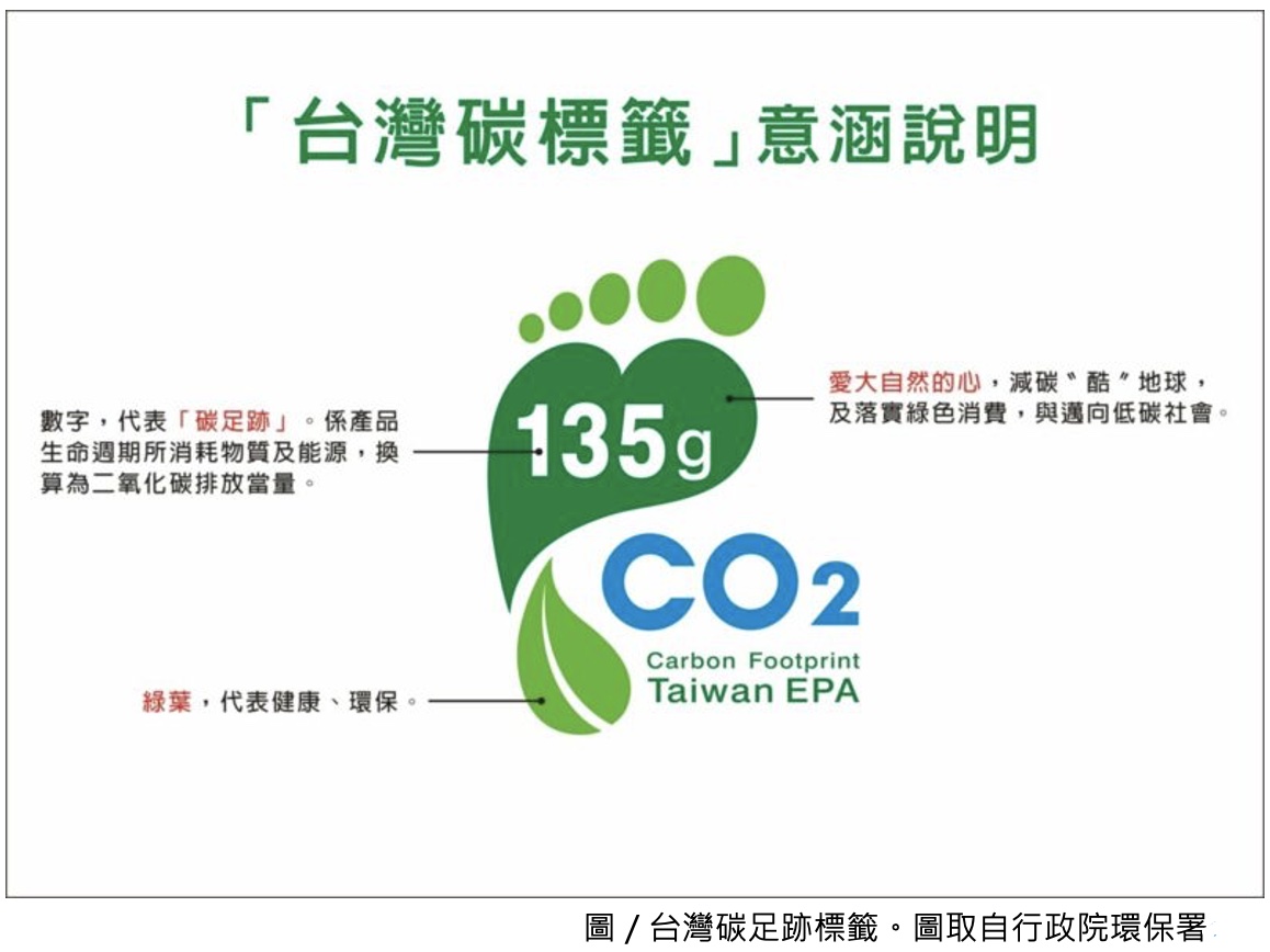 「碳足跡標章」 Carbon Footprint Label)又稱「碳標籤」(Carbon Label)用以顯示產品(含服務)生產歷程碳排放量之標示。